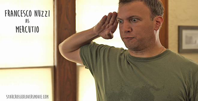Mercutio is an army vet of Verona, a kinsman to the prince, an alcoholic, and suffers from Post Traumatic Stress Disorder. When the movie starts he is on leave from active duty and tries to re-acclimate to civilian living by attending the Capulet Party and hanging out with Romeo and Benvolia who he looks at as a little brother and sister.